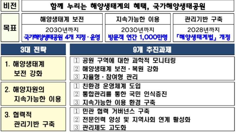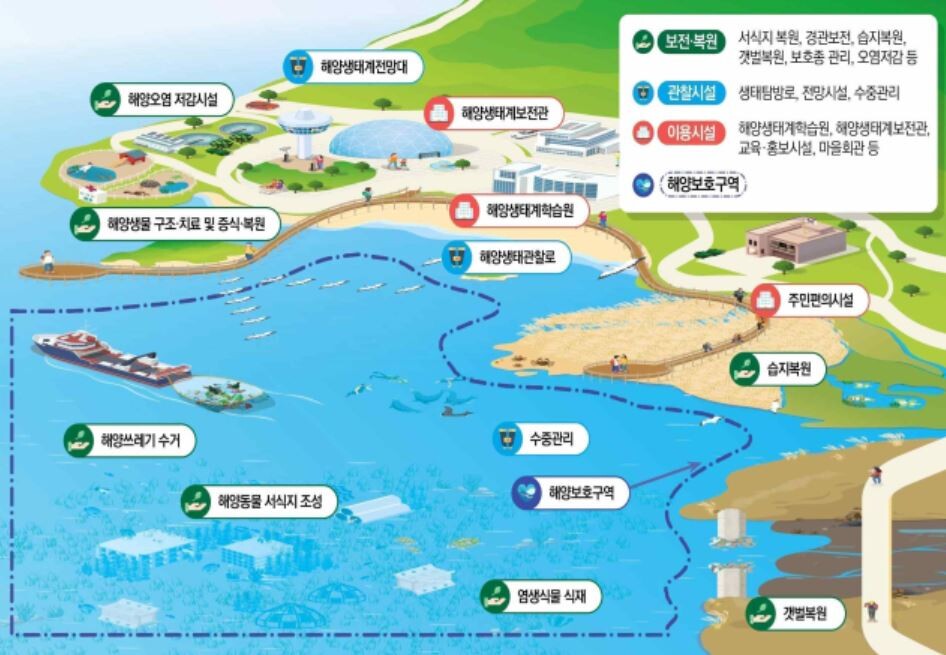 해수부는 우수한 해양생태 자원의 합리적 이용을 통해 보전과 이용이 공존차원에서 국가가 직접 지정하는 '국가해양생태공원 제도'를 도입했다.
