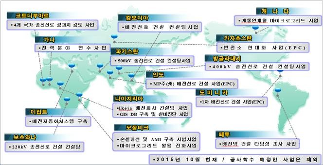 한전은 세계 최고 수준의 송·배전 기술력과 운영 노하우를 기반으로 카자흐스탄, 인도, 도미니카 등 23개국에서 1억 7000만 달러(1930억원)의 송배전망 건설·컨설팅 사업을 성공적으로 완료, 현재 나이지리아, 캄보디아, 파키스탄 등 13개국에서 총 4000만 달러(450억원) 규모의 송배전사업을 수행중이다.