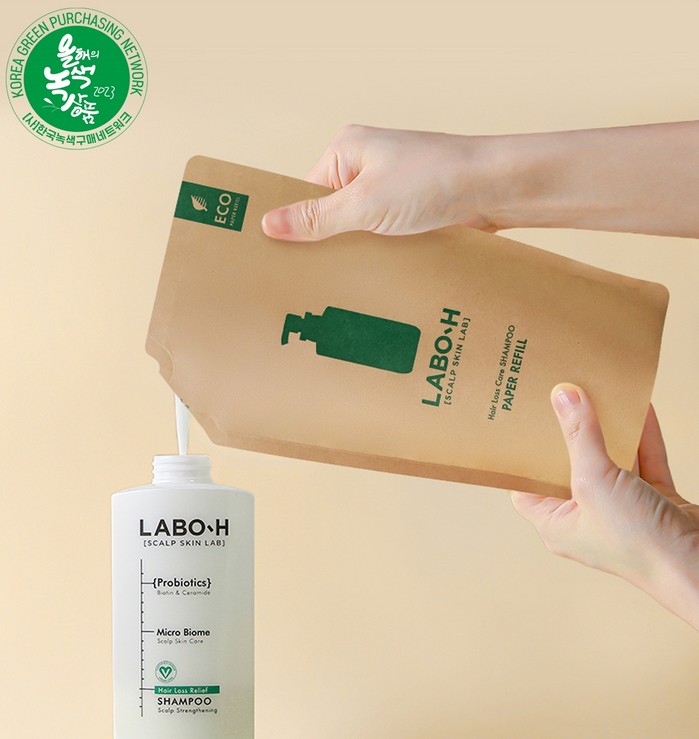 이번에 수상한 '라보에이치 두피강화 샴푸 리필' 제품은 재활용할 수 있는 종이 소재를 사용해, 본품 대비 플라스틱 사용량을 90% 줄였다.