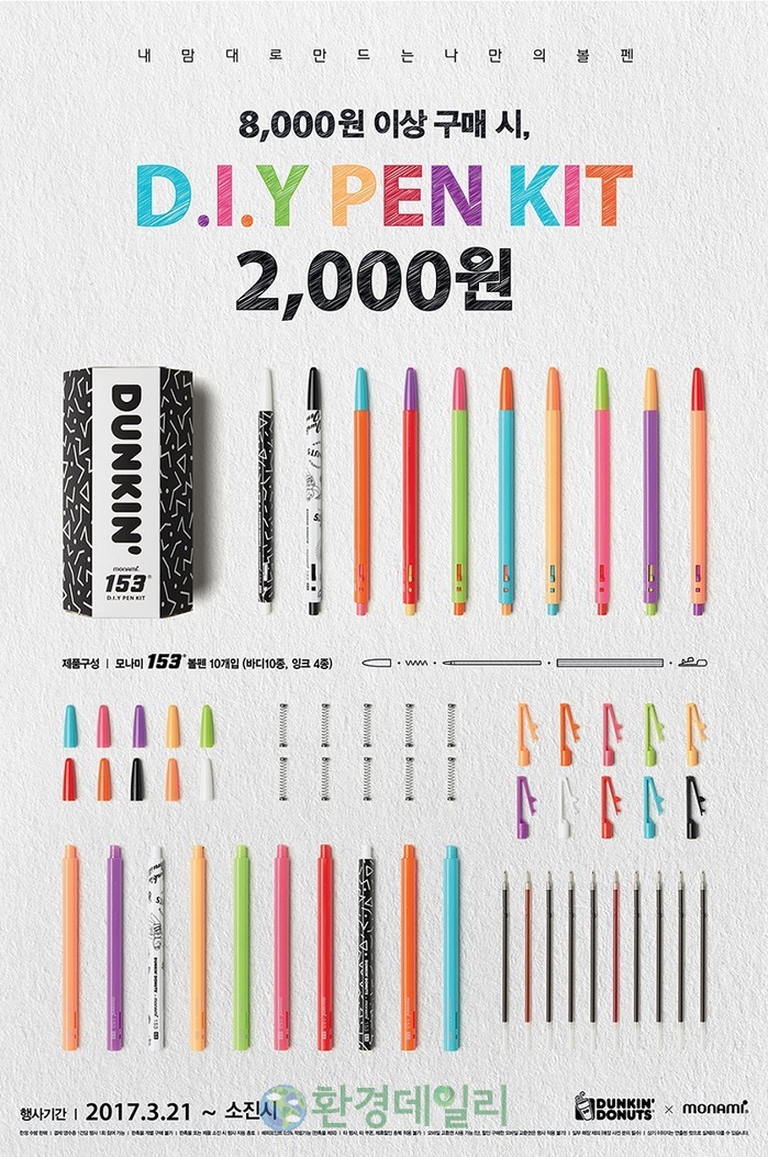던킨도너츠는 3월 신학기 시즌을 맞아 매장에서 8000원 이상의 제품 구매 시 '던킨도너츠X모나미 DIY PEN KIT'를 2000원에 제공한다고 밝혔다.