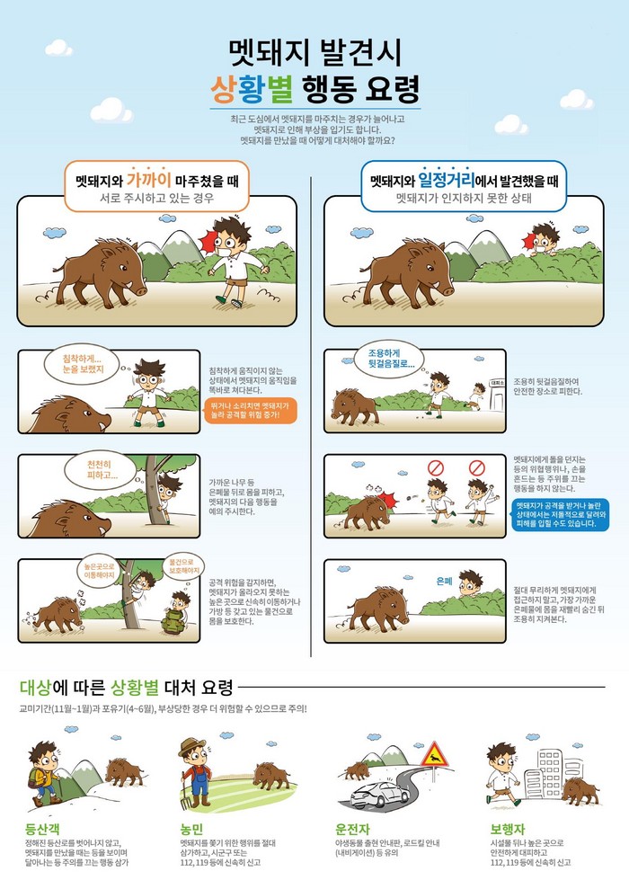 국립야생동물질병관리원은 야생멧돼지가 번식기인 이달부터 새끼를 낳은 후 저지대에서 가족무리로 먹이활동을 하는 경우가 많고, 폐사체도 쉽게 눈에 띌 수가 있어 적극적으로 신고할 수 있도록 안내문(포스터)을 제작 전국 지자체에 배포했다.