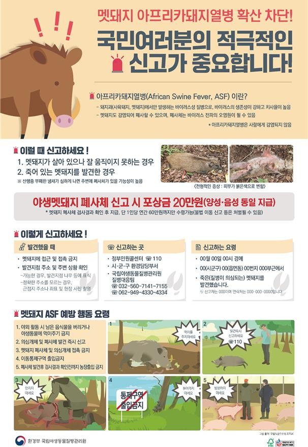 야생멧돼지 폐사체를 신고할 경우 포상금 20만 원이 지급되며, 국립야생동물질병관리원(032-560-7141~7155, 062-949-4333~4334) 및 전국민원콜센터(110)를 통해 전국 지자체 시군 환경과에서 폐사체 신고를 받고 있다.