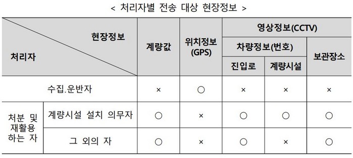 폐기물처리 현장정보를 한국환경공단에서 관리하고 있는 (가칭) 폐기물처리 현장정보관리시스템에 전송하게 된다. 이 시스템에서 폐기물 수집‧운반자는 폐기물 수집‧운반차량에 GPS를 설치해 실시간 위치정보를 전송해야 한다. 이를 통해 폐기물 불법투기 의심 지역 경유 등 이상 운반 경로를 탐지한다.