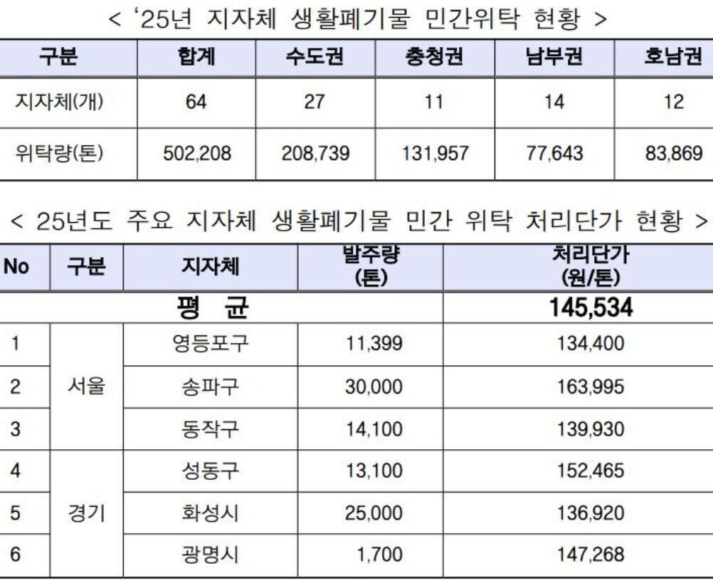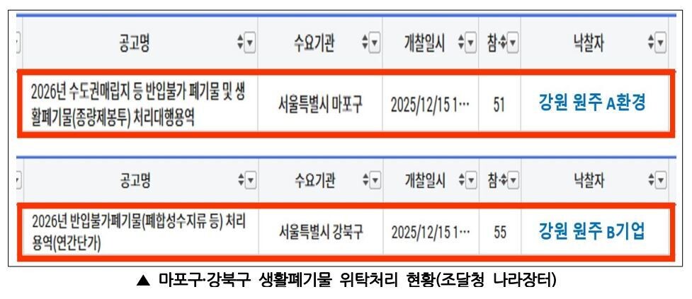 조달청 나라장터 계약 현황을 보면, 마포구는 생활폐기물을 강원 원주에 있는 재활용업체 A환경으로 보내 처리하고, 강북구는 원주의 재활용업체 중견 기업로 보내 처리하고 있다.