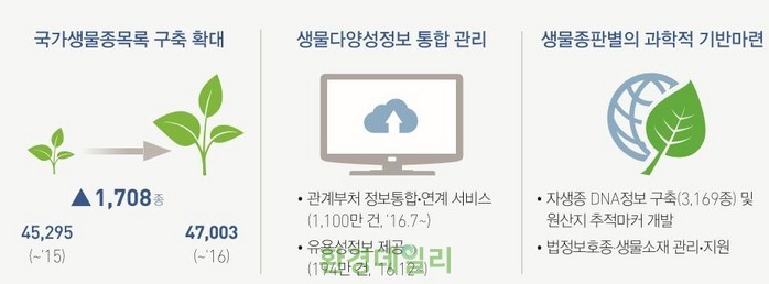 2016년 기준 국립생물자원관은 나고야의정서 국내 비준을 앞두고 국내 자생생물 발굴과 관리에 박차를 가해 1700여종, 총 4만7000여종에 이르는 국가 생물종 목록을 구축했다.