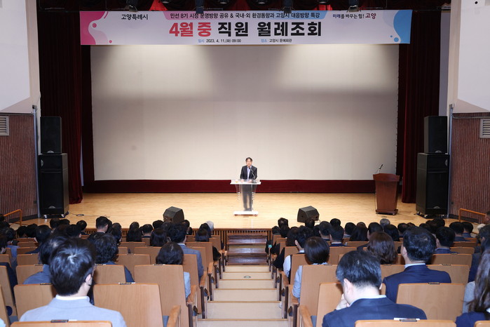 이날 월례조회에서 정태용 연세대 국제학대학원 교수가 '국내외 환경동향과 고양시 대응방향' 특강을 진행했다.