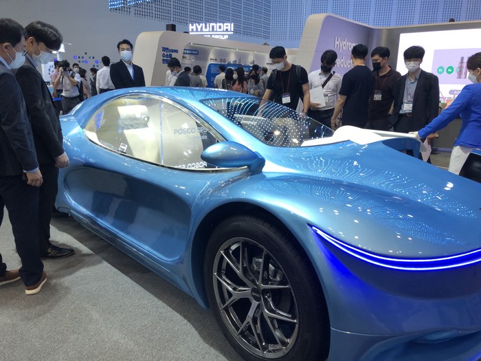 ▲지난해 열린 수소 모빌리티쇼에서 포스코에서 선보인 수소차 컨셉트카를 관람객들이 살펴보고 있다. |