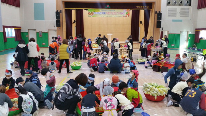 서면 아화초등학교에서 시범운영하고 있는 '어린이 농부학교' 학생과 학부모, 선생님 등 80여명은 2일 직접 재배하고 수확한 배추를 이용 '아화 사랑의 김장담그기 Day!' 행사를 가졌다.