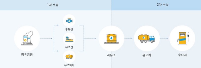 ▲국내 4개사 정유회사로부터 공급받은 유류는 저유소로 공급받아 저장해뒀다고 주유소 유조차 등이 옮겨져 일반에 공급하는 시스 템이다. 발췌 대한송유관공사 |