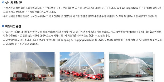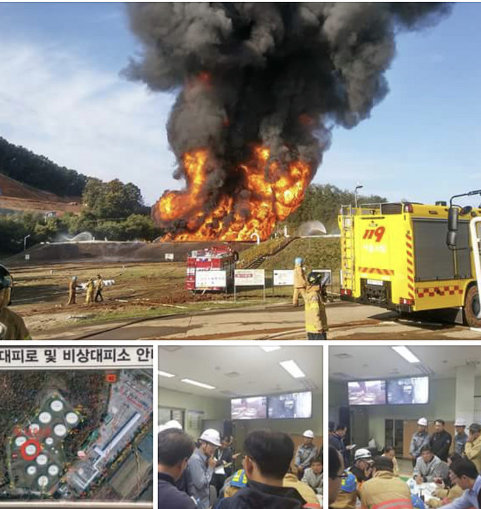 ▲대한송유관공사는 저유소에 대한 화재대비안전훈련 등 매뉴얼을 철두철미하게 지킨다고 했지만 실제로 화재 발생하지 전혀 손을 쓰지 못한 것으로 드러났다. 사진은 공사에서 일반인들에게 오픈된 설비안전관리, 비상대응훈현을 이렇게 한다고 소개하고 있다. |
