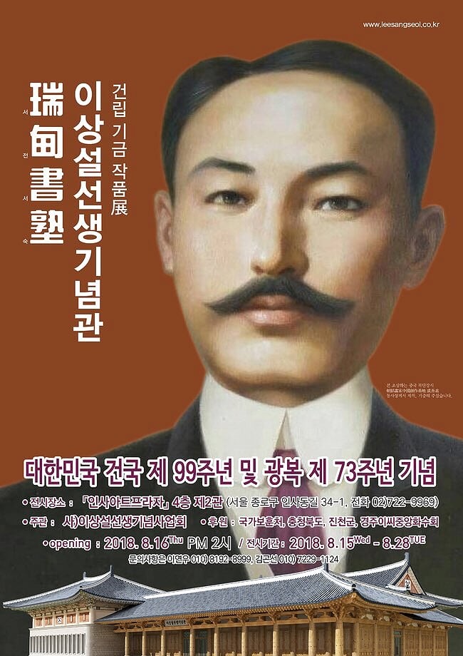 [환경데일리 김영민 기자]사단법인 이상설선생기념사업회(회장 이석형)와 이상설선생기념관건립위원회(위원장 이종찬)는 정부수립 제99주년과 광복 제73주년을 맞는 8월 15일부터 28일까지 인사동 인사아트프라자에서 '서전서숙' 이상설선생기념관 건립을 위한 기금모금 작품전을 개최한다.