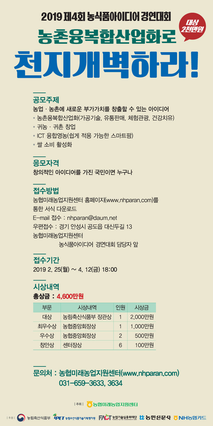 창의적인 아이디어를 가진 국민은 누구나 참가할 수 있으며, 공모 주제는 '농촌융복합산업화로 천지개벽하라!'이다.