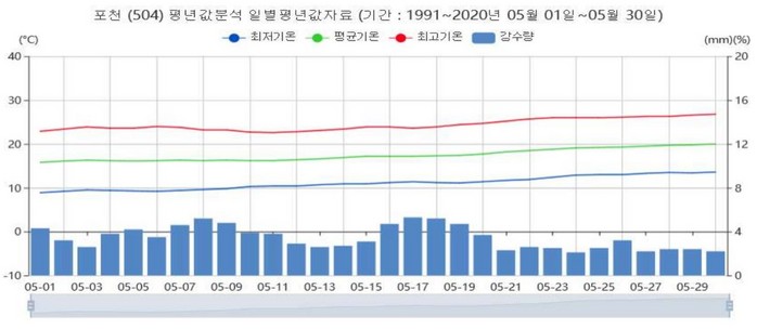 ▲경기도 포천일대 지난 30년간 기온 변화와 감수량이 현실을 보여준 데이터다. 기온은 오르고 비는 적게 내리는 것으로 집계 됐다. |
