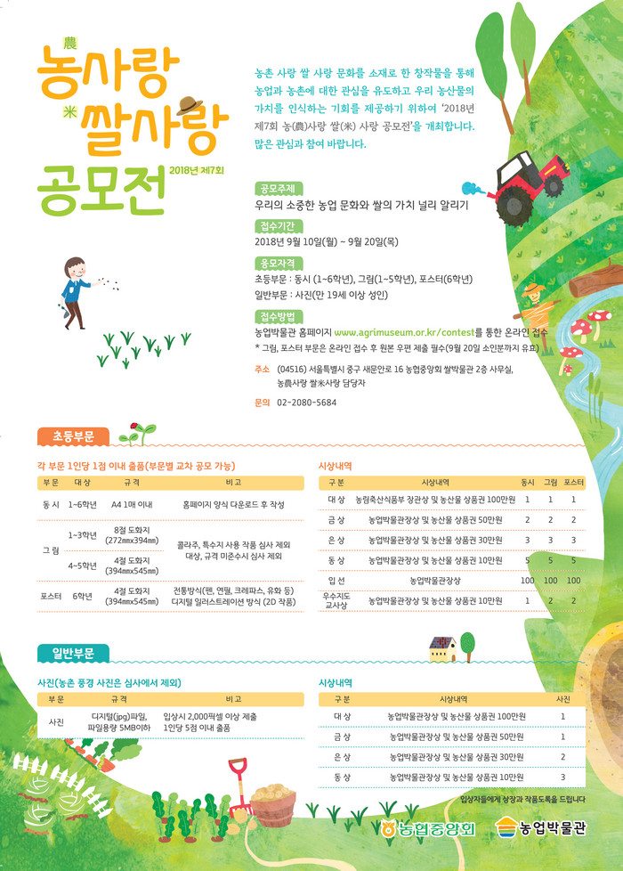 '우리의 소중한 농업 문화와 쌀의 가치 널리 알리기'라는 주제로 진행되는 이번 공모전은 어린이를 대상으로 하는 동시·그림·포스터 부문과 일반인 대상의 사진 부문으로 이뤄진다. 동시·그림·포스터 부문은 초등생, 사진 부문은 성인이면 누구나 참여 가능하며, 농업박물관 홈페이지를 통해 온라인으로 접수하면 된다.