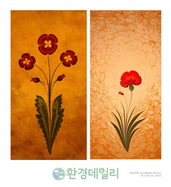 에브루 기법: 큰 그릇에 담긴 물 위에 여러 색상의 물감을 흩뿌리거나 붓질해 그림을 그린 후 종이를 덮어 전사하는 터키 전통예술 기법 (유네스코 인류무형문화유산)