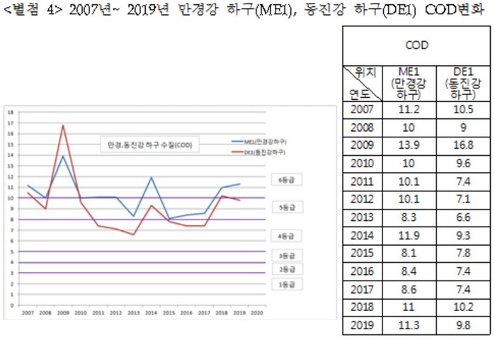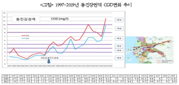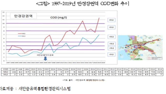 이정미 의원이 새만금유역통합환경관리시스템 자료를 확인한 결과 만경강, 동진강 하구 수질 역시 새만금호 상류 수질개선사업의 효과가 잠시 나타난 것으로 보였지만, 18~19년 다시 COD가 증가해 수질등급 5~6등급인 원점으로 돌아온 것을 확인할 수 있었다.