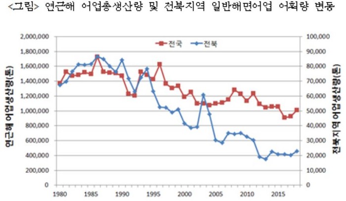 국회 환노위 이정미 의원은 해양수산부가 제출한 '1980~2018 연근해 어업총생산량 및 전북지역 일반해면어업 어획량 변동'자료를 확인한 결과, 약 30년간 전북지역의 어업생산량이 4만4000톤(66%) 감소한 것을 확인했다고 밝혔다.