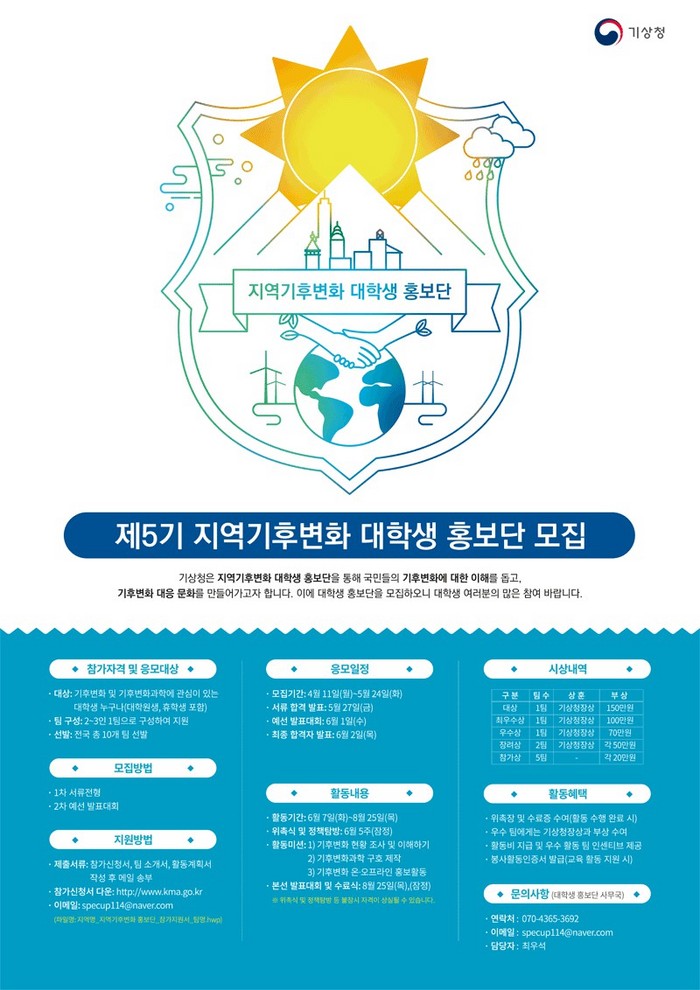 [환경데일리 김영민 기자] 기상청이 5월 24일(화)까지 기후변화 대응 문화를 만들어갈 제5기 지역기후변화 대학생 홍보단을 모집한다.