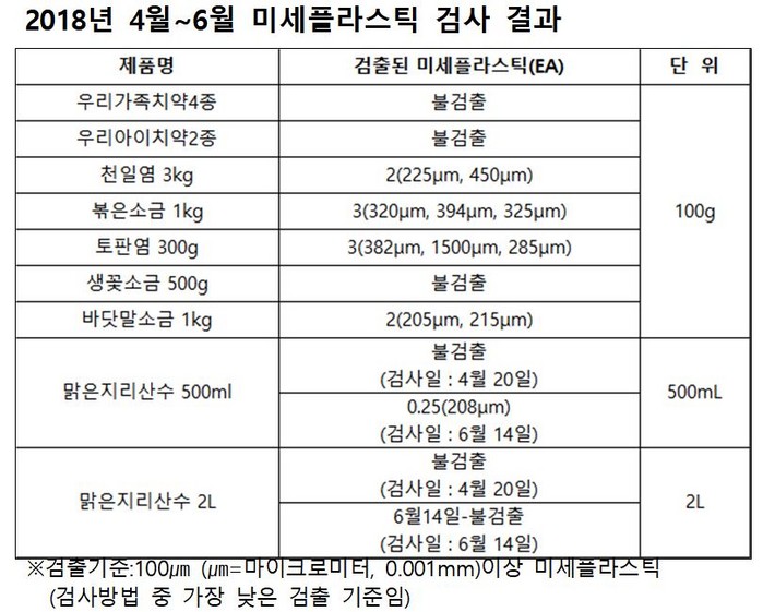 아이쿱생협 자연드림은 최근 검사결과를 알려왔다. 미세플라스틱 검사는 물질을 구성하는 무기질, 단백질 등의 성분을 분해한 뒤 여과, 건조 후 남은 플라스틱을 확인하는 까다로운 방식으로 이뤄진다. 이 검사는 국내에서 몇몇 연구기관에서만 가능하며, 특히 수산물 등을 현재 조사할 수 있는 공인검사기관은 없다. 그래서 먹는 물, 소금, 치약 등 검사 가능한 분야에 대한 검사를 우선 실시했다.