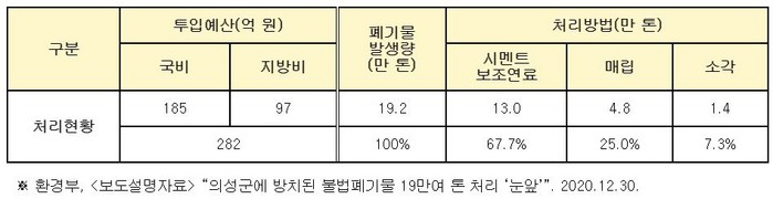 이에 대해 환경부 관계자는 "소성로 배출시설에서 폐기물을 태우는 건 문제가 있지만 불가피하게 의성에 방치된 폐기물을 소각할 수 밖에 없는 상황이었다."며 "환경부에서 매년 다루는 제도개선에서 시멘트 소성로 배출시설에 대한 배출기준을 강화하는데 어느 정도 의견을 모은 것으로 안다."고 전했다.