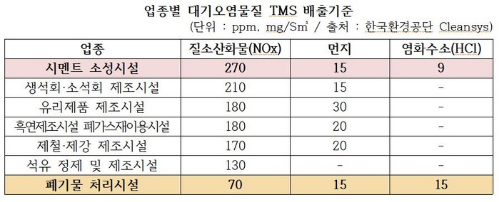 여기에 국내 시멘트 제조사들의 소성시설 대기오염물질 배출기준도 대표적 오염물질 관리 시설인 폐기물 소각전문시설에 비해 현저히 약하다.