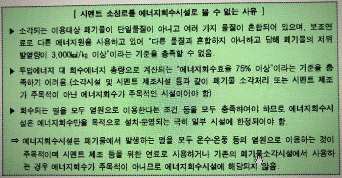또한 환경영향평가법 시행령에 중간처분시설 중 소각시설로서 처리능력이 1일 100톤 이상의 시설을 환경영향평가 대상으로 하고 있다.반면 시멘트 소성로 시설은 연간 1000만 톤이 넘는 폐기물을 연료로 사용해 소각하고 있음에도 정부가 규정하는 환경영향평가 대상에서도 제외돼 있다.
