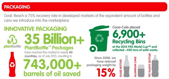 이 협정은 병과 깡통의 설계 및 제조 방법에서부터 어떻게 재활용되고 재활용되는지에 이르기까지 전체 포장 수명 주기에 초점을 맞춘 코카콜라는 '폐기물 없는 세상'을 지원한다. 종합적인 3개-필라 계획(Design, Collect, Partner)은 2030년까지 최소 50%의 재활용 재료로 포장재를 생산하고, 2030년까지 회사가 판매하는 모든 제품에 대해 병이나 캔을 수집하고 재활용하는 것을 돕고, 세계적인 플라스마 문제를 해결하기 위해 산업, 정부 및 지역 사회와 협력하는 야심찬 목표다. 쓰레기 아이오니카와 루프 협정은 디자인 기둥을 지지하는 100% 공감하고 있다.