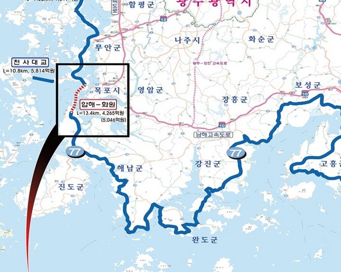 목포시는 신안 압해 ~ 목포 율도 ~ 목포 달리도 ~ 해남 화원을 잇는 국도 77호선 1·2공구 도로건설공사가 8일 입찰공고를 시작으로 본격 추진된다고 밝혔다.