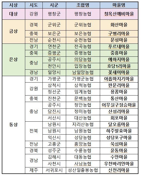 대상 수상마을은 행안부 장관상 및 시상금 5000만원을, 금상수상 3개 마을은 행안부 장관상, 농협중앙회 회장상 및 시상금 3000만원을, 은상수상 5개 마을에는 회장상 및 시상금 2000만원을, 동상수상 15개 마을에는 회장상 및 1500만원을 수여했다.