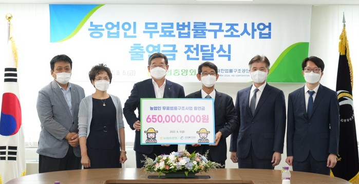 [환경데일리 문종민 기자]농협중앙회(회장 이성희) 장덕수 농업농촌지원본부장이 5일 서울 서초구 대한법률구조공단 서울 중앙지부를 방문해 김진수 대한법률구조공단 이사장에게 '농업인 무료법률구조사업' 출연금 6억5000만원을 전달하고 있다.