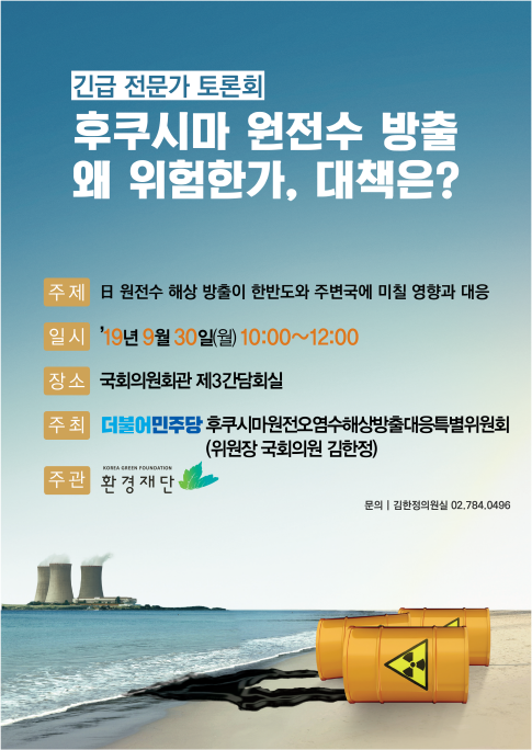 [환경데일리 한영익 기자]더불어민주당 후쿠시마원전오염수해양방출대응특위 위원장인 김한정 의원(남양주을)은 30일 국회에서 '후쿠시마 원전오염수 방류 왜 위험한가, 대책은?'이라는 주제로 전문가 토론회를 개최한다고 밝혔다.