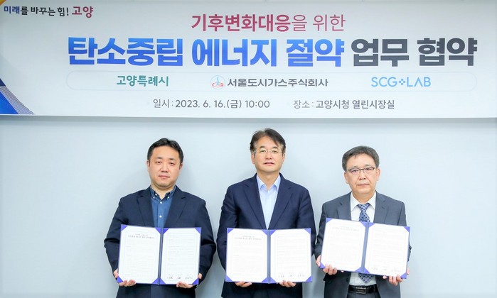 [환경데일리 문종민 기자]고양특례시(시장 이동환)가 16일 열린시장실에서 서울도시가스주식회사와 에스씨지랩(SCGLAB)과 함께 '기후변화대응 탄소중립 에너지 절약 업무협약'을 체결했다. 협약을 통해 3개 기관은 탄소중립 사회를 선도하고 에너지 분야 탄소중립포인트(에너지 분야) 활성화를 위해 협력할 예정이다.