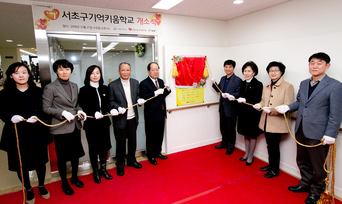 ▲생명보험사회공헌재단이 운영하는 서울 서초구에 18번째 기억키움학교가 문을 열었다. 21일(수) 서울 서초구 치매지원센터에서 진행된 개소식에 (왼쪽부터) 주수현 서초구치매지원센터장, 권영현 서초구보건소장, 송영신 시니어희망공동체 대표, 최규정 서초 구기억키움학교 학생대표, 유석쟁 생명보험사회공헌재단 전무, 천정욱 서초구부구청장, 권영희 서초구약사회장, 박명수 서초구기 억키움학교 학생가족대표, 최형순 내곡동주민센터 동장이 참석했다. |