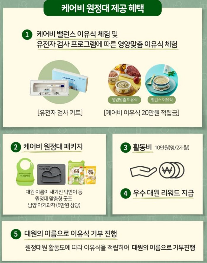 이러한 케어비가 처음으로 공식 서포터즈를 모집하는 가운데, 서포터즈 '케어비 원정대'1기 모집 인원은 30명이다. 모집 대상은 이유식에 정체기를 겪고 있는 15개월 미만 아이, 유전자 검사를 통해 부족한 영양소를 확인하고 싶은 아이, 케어비 이유식을 누구보다 맛있게 먹는 모습을 보여줄 수 있는 아이로써, 육아 관련 블로그, 카페, SNS 활동 시 당첨 확률이 높아진다.