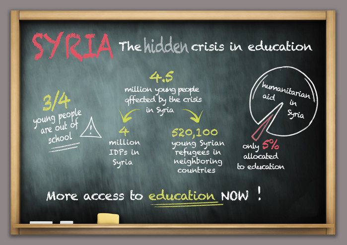 수 많은 시리아 난민들, 특히 소녀들은 더 이상 학교에 다니지 않는다. 사춘기에 접어든 10대 소녀들은 특히 위험에 취약하다. 그들의 신체가 변화하고 있지만 가족으로부터 마땅히 받았어야 할 도움이 불가능한 경우가 있기 때문에 그들은 자존감을 상실하고 학교와 교육으로부터 방치된 채로 남겨진다. 또한 난민 사태에 영향 받은 많은 젊은 여성들은 성별에 기반한 편견의 장벽에 가로막혀 훈련을 받을 기회가 없기 때문에 계속 집에만 머무르게 되어 일을 하거나 가족을 위해 돈을 벌 수가 없다.