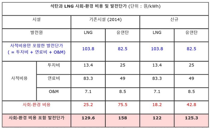 지난 19일, 국회도서관에서 열린 '석탄화력발전의 사회환경 비용과 에너지 전환 방안'토론회에서 KEI는, 이제까지 빠져있던 '환경비용을 포함한 석탄 발전단가'를 산정해서 발표했습니다. 여기에서 '환경 비용'이란, EU와 IMF가 제시한 계산법에 따라 비온실가스 환경비용과 온실가스 비용(배출거래제 기준)을 포함한 값입니다. 이 연구결과에 따르면, 2014년 기준 석탄발전소의 환경비용은 LNG 환경비용의 3배에 달하고, 오염 저감시설 등의 기술을 도입한 신규 시설도 LNG보다 2.3배 많은 환경비용을 발생시킵니다.