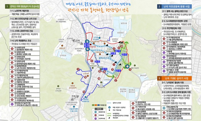 '난곡.난향동 도시재생활성화계획(안)'은 '관악산 자락 동행마을 평생살이 난곡'이라는 비전과 '더 나은 주거·생활기반 조성, 더 유쾌한 난곡 생활문화 창출, 더 행복한 골목공동체 회복'이라는 목표 아래 9개 마중물사업과 28개 연계사업 등 총 37개 세부사업을 포함하고 있다.