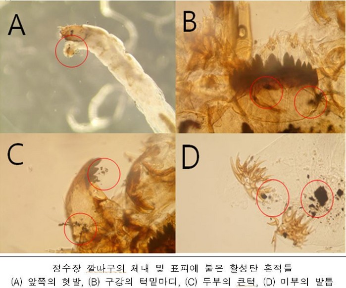 특히, 추가 조사에서 활성탄 지에 서식한 깔따구 유충은 배수지등의 공급계통으로 유출됐을 때에 체내와 표피(머리, 꼬리 부분 등)에 활성탄의 미세입자가 부착돼있어, 활성탄 지에서 유출됐다는 흔적이 남는 것을 확인했다.