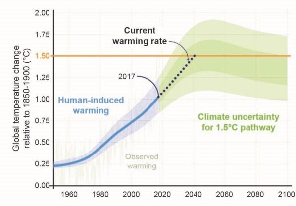 | ▲산업화 이전 대비 지구평균 기온은 1°C 상승했다. 이대로 배출량이 증가하면 2040년경 1.5°C에 도달한다. |