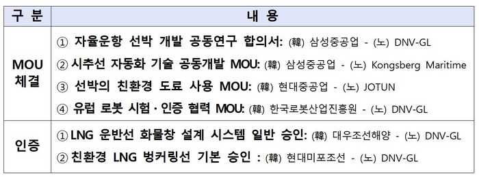 산업통상자원부는 한-노르웨이 정상회담계기, 양국 산업계가 4건의 협력 양해각서를 체결하고, DNV-GL(노르웨이-독일선급)로부터 우리 조선사 친환경 기술 2건에 대한 인증을 받았다고 밝혔다.