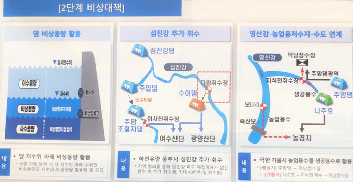 환경부는 2단계로 댐비상용량 활용, 섬진강 추가 취수, 영산강, 농업용저수지 수로 연계로 추진할 예정이다. 박 정책관은 "장관이 현장을 올해만 5번을 찾아 가뭄대책을 논의했고 아직 안심할 상황은 아니다. 올 여름이 가뭄 해갈때까지 집중하겠다."고 했다.