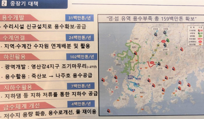 박 정책관은 "환경부는 물수급 대책으로 상시 가뭄 159만톤을 공급해야 하지만 24만 톤은 부족한 실정"이라고 분석하고 "기후변화를 고려한 생활 공업용수 공급량은 126만 톤이 예상되지만 57만톤이 부족하다."고 밝혔다.