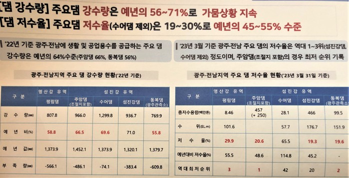 긴 가뭄 상황에서 영산강, 섬진강 유역 댐 강수량 실태가 한 눈에 들어온다. 두 유역 내 주요댐인 평림댐, 주암댐, 수어댐, 섬진강댐, 동북댐, 장흥댐 예년 대비 56~71%로 가뭄 극복을 이겨내지 못하고 있다. 주요댐 저수율은 19~30%로 예년 45~55% 수준으로 밑돌고 있다.