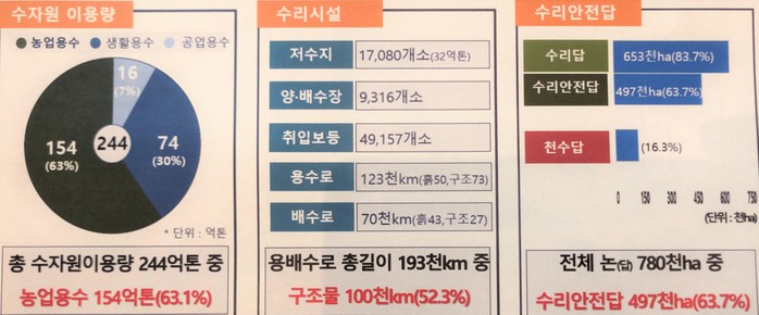 수자원 이용량은 총 244억 톤 중에 농업용수는 154억 톤(63.1%), 용배수로 총길이는 19만3000km 중 구조물 10만km에 달한다. 전체 논(답)는 78만ha중 수리안전답은 49만7000ha다. 영산강 섬진강 용수시설은 1만4125개소로 저수지는 평균 81% 확보하고, 나머지는 양수장, 취입보로 이뤄져 있다.