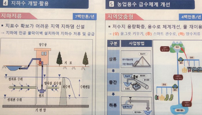 댐간 연계 등 물 공급체계 조정, 하수 재이용 등 대체 수자원 확보, 지방상수도 현대화사업 및 농업용 저수지-수도 연계사업 등까지 필요한 예산이 집중되는 대목이다. 여기에 가뭄이 극심한 섬(도서) 지역에의 물 공급을 위한 지하수 저류댐 설치 확대, 이동식 해수담수화 시설 활용 계획도 포함돼 있다.