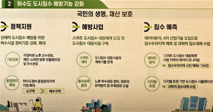 물인프라 탄소중립을 위해 에너지 자립률을 2030년까지 50%까지 올리고, 바이오가스 생산도 연간 5억 톤까지 산업 활성화도 힘을 보탤 예정이다. 하수도 도시 침수 예방 차원에서 도시침수 및 안전사고를 제로화하는데 역량을 모을 예정이다.