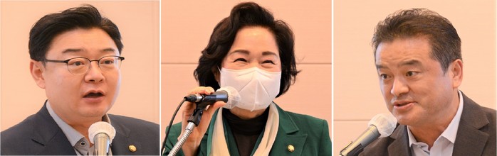 | ▲(사진 왼쪽부터) 김성원 의원, 조명희 의원, 임종성 의원이 K-eco 비전 선포식에서 참석해 물인프라 구축과 물산업 디지털 대전환에 대해 국민의 안전한 물공급 및 턴소중립의 매개체가 되도록 국회 차원에서 적극 돕겠다고 말했다. |