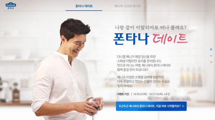 이번 이벤트는 폰타나 브랜드 모델인 다니엘 헤니가 이탈리안 요리를 선보이며 특별한 일상을 선사한다는 콘셉트다. 소비자가 직접 메뉴를 선택하면 다니엘 헤니가 요리에 대한 추억을 전하며 폰타나 제품으로 완성할 수 있는 근사한 이탈리안 요리를 소개한다.