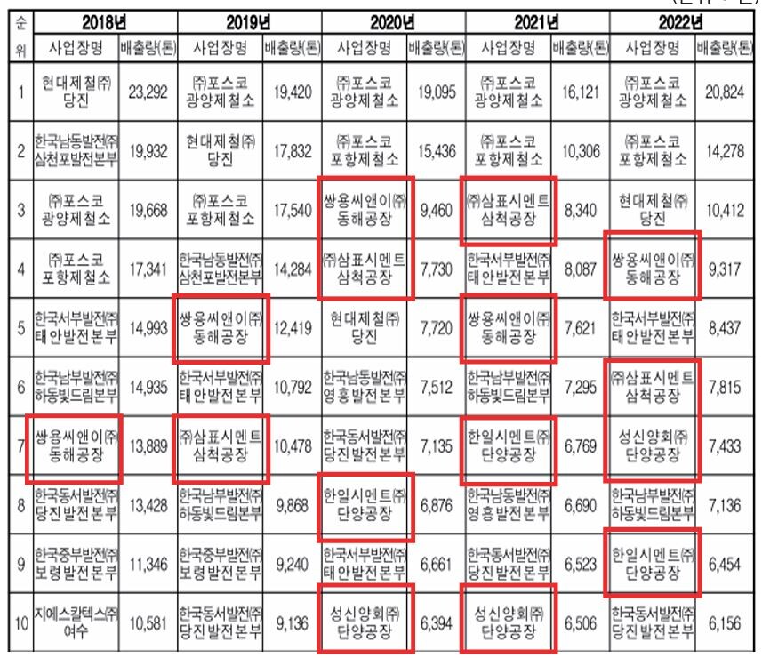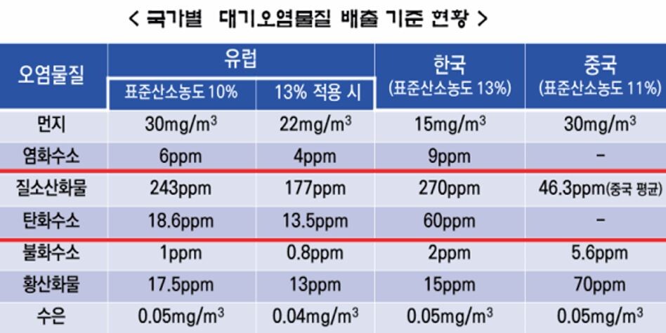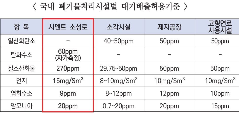 시멘트공장 굴뚝에서 나오는 독가스인 1급 발암물질인 질소산화물(NOx) 배출기준은 270ppm이다. 일반 소각장 기준 50ppm에 비해 5배 이상 높다.