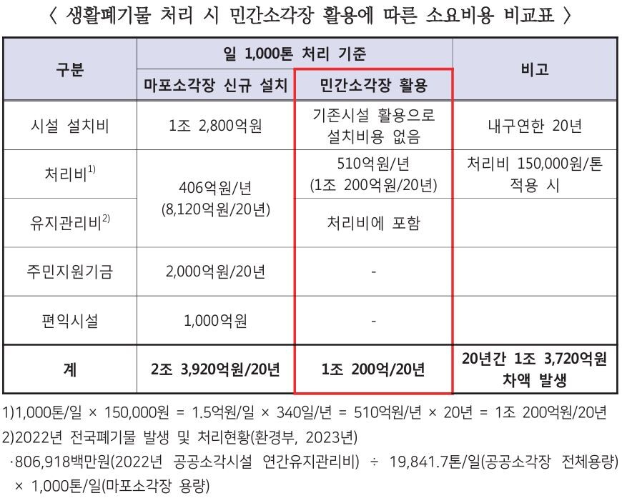 민간소각장 위탁 시 경제성은 월등하다는 주장이다. 마포소각장 하루 1000톤 기준 신규 설치 시 약 20년간 약 2조 4000억원이 소요된다. 하지만 기준 민간소각장을 이용하면 약 1조 200억원으로 약1조 3800억원의 비용을 절감할 수 있다.